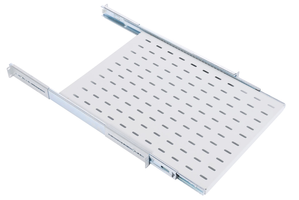 Полки имеют телескопические направляющие, обеспечивающие плавное выдвижение. Монтажные кронштейны фиксируют полку к вертикальным направляющим шкафов и стоек в четырех местах. Глубина монтажных кронштейнов регулируется, что позволяет устанавливать полку на необходимую глубину. Полка перфорирована для свободного прохождения охлаждающего воздуха. |