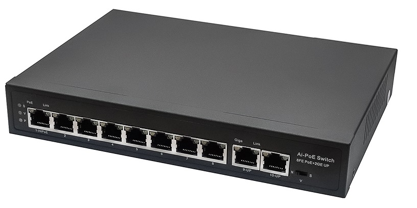 PoE коммутатор Fast Ethernet на 10 RJ45 портов. Порты: 8 x FE 10/100 Base-T с поддержкой PoE IEEE 802.3af/at, 2 x GE 10/100/1000 Base-T. Соответствует стандартам PoE IEEE 802.3af/at. Автоматическое определение и режим антизависания PoE устройств. Мощность PoE на порт - до 30W. Суммарная мощность PoE - до 115W. Поддержка режима CCTV: Увеличение расстояния передачи данных и питания до 250м, изоляция портов VLAN. Встроенная грозозащита 6кВ. Питание: AC100-240V 123W. Размеры ШxВxГ: 210x3