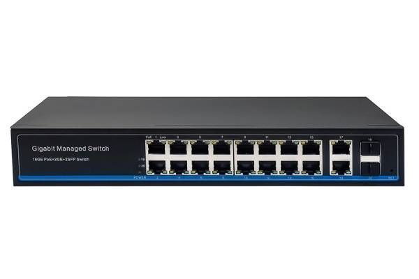 Управляемый L2 PoE коммутатор Gigabit Ethernet на 16 RJ45 PoE 2 x RJ45 2 GE SFP портов. Порты: 16 x GE 10/100/1000 Base-T с поддержкой PoE IEEE 802.3af/at, 2 x GE 10/100/1000 Base-T Uplink, 2 x GE SFP Uplink. Соответствует стандартам PoE IEEE 802.3af/at. Автоматическое определение и режим антизависания PoE устройств. Мощность PoE на порт - до 30W. Суммарная мощность PoE до 300W. Поддержка режима CCTV: Увеличение расстояния передачи данных и питания до 250м. Встроенная грозозащита 3kV